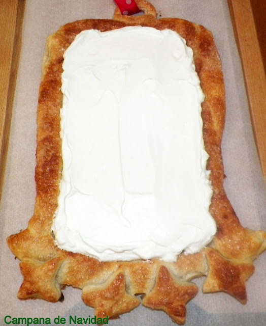 Dibuja el perfil de una campana sobre cartulina, recórtalo y úsalo como molde. Corta tres campanas idénticas de hojaldre de más o menos 30 cms. de largo.  Pon en una bandeja de horno una de las campanas y pínchala con un tenedor para que no se abombe cuando lo metas en el horno. Coloca una a una las otras dos campanas, recórtales el centro y deja aproximadamente 2 cms. de borde. Con una brocha échale agua y vas pegando los bordes para ir haciendo una cavidad. Reserva el resto de masa que va sobrando para hacer con unos cortadores de galleta 8 estrellas o alguna otra figura que quieras y un círculo más grande y otro más pequeño para hacer el asa por donde va la cinta de arriba. Con la masa restante, hice unas palmeritas. Hice 8 estrellas para darle más volumen al adorno igual que los círculos de arriba, lo que quiero decir es que hagas el doble en vez de una estrella 2 y las pegas con agua.