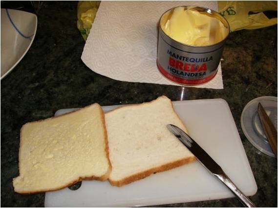 Untamos las rebanadas de pan de molde con mantequilla por las dos caras, raspando con un cuchillo la mantequilla sobrante,  para que no tenga mucha pero quede por todos los lados untada de mantequilla.