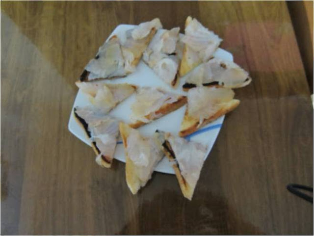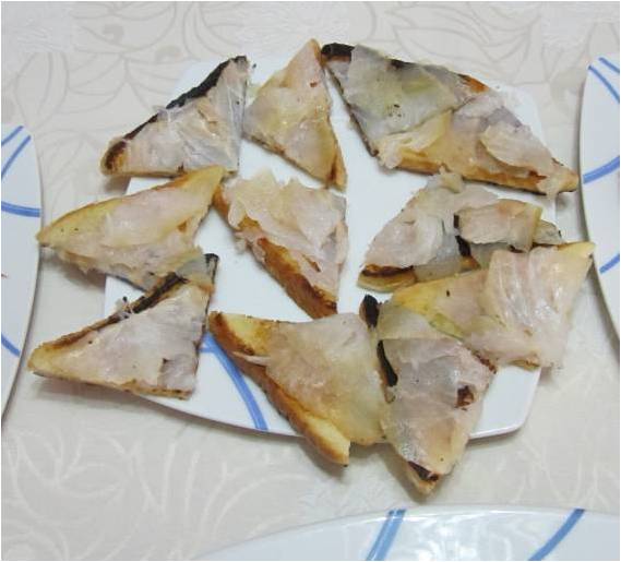 Cada rebanada de pan , ya tostada la cortamos en 4 triángulos, les ponemos unas lonchas de merluza ahumada y unas gotas de limón encima .