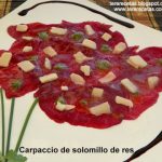Para empezar un rico carpaccio de lengua con timbal de pebre de mote, continuamos con el plato de fondo, pulpa de cordero al vino tinto acompañado de papas paradas y ensaladita de rúcula y para terminar un postre especial, leche asada de cola de mono con salsa de caramelo y arándanos marinados en pisco.