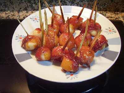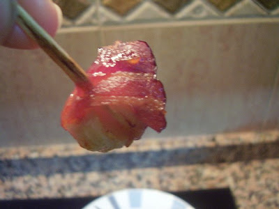 Enrollamos cada trozo de bacon en una castaña y sujetamos con mondadientes.