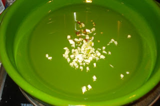 En una cazuela de barro, poner 4 ò 5 cucharadas de aceite, el diente de ajo picado y un poco de guindilla.