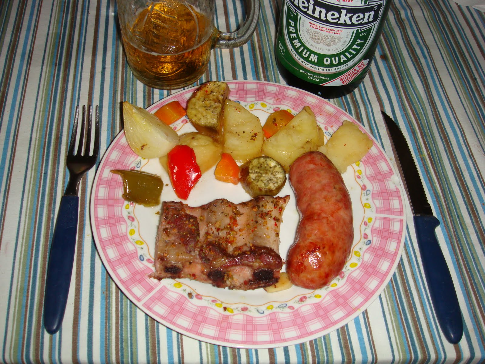 Salar el pechito de cerdo con sal gruesa y condimentar con una cucharada del condimento para preparar chimichurri y el jugo de medio limón. Colocar los chorizos y el pechito sobre una parrilla o rejilla por encima de la fuente con los vegetales. De esta forma al cocinarse, los jugos y el desgrase del pechito de cerdo y de los chorizos caen sobre los vegetales dándole a los mismos un sabor único y delicioso.