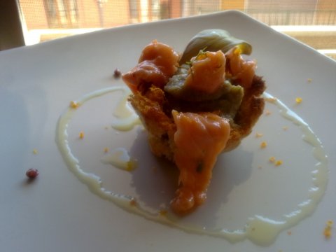 Pastelito de boquerones relleno de arroz y alcachofas al perfume de limon con corazon blando de ricotta