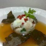 Consomé de pescado y té negro con bolas de dorada y pimienta rosada