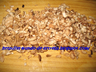 Le quitamos a los champiñones el tronco. La parte de arriba del champiñón la lavamos bien y la dejamos escurriendo. La parte del tronco del champiñón, le cortamos la parte de la tierra y la tiramos, la otra parte la troceamos muy pequeñita. En una sartén ponemos los champiñones que hemos picado a fuego medio con un poco de aceite para que se vaya rehogando.