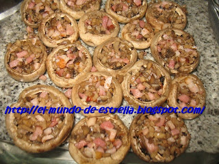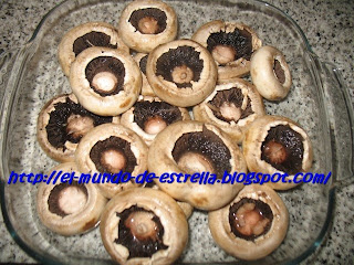 Los champiñones que tenemos en el microondas los sacamos, los ponemos en una fuente todos boca arriba para rellenarlos mas cómodamente y libres de líquidos.