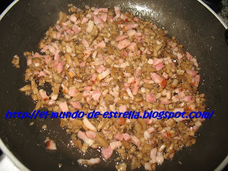 Picamos el bacon y lo añadimos a los champiñones que tenemos en la sartén rehogandose.