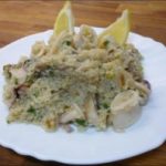 Rape con tallarines de chipirón encebollado y salsa yodada