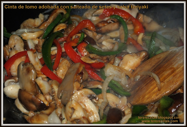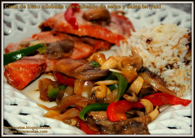 Aprovechando que ahora hay unas setas estupendas y a muy buen precio, se me ocurrió hacer un salteado con las setas, cebolla, pimiento y salsa teriyaki, la famosa y rica salsa japonesa, hecha con salsa de soja, sake (vino de arroz), vino blanco dulce y un poco de azúcar que le da ese sabor dulce característico y como tenía unos filetes de cinta de lomo adobada en casa, pues que mejor combinación, me puse manos a la obra y ha quedado un plato riquísimo!!