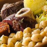 El espinazo se enjuaga bien para que suelte la sal. A continuación, se echan en la olla los garbanzos, las pastillas de caldo, el repollo y, salvo el chorizo, el resto de los ingredientes, procurando echar al final los que vamos a descartar (el puerro, el apio, el espinazo y el hueso de jamón si no tiene jamón que aprovechar).