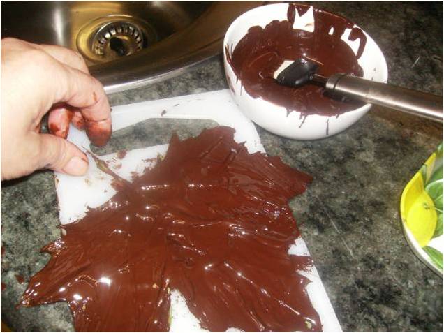 Si en chocolate esta caliente hay que esperar a que tempero un poco y quizás se necesite dar dos manos de chocolate, si las hacemos con hojas grandes hay que darles varias manos para que tengan cuerpo y no se nos rompan.