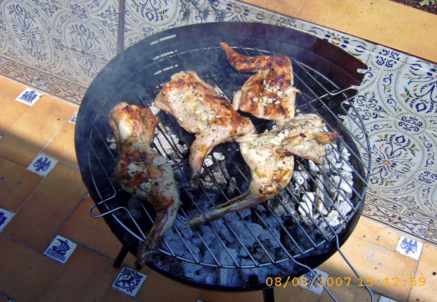 Preparamos la barbacoa de forma que el carbón este bien repartido y el fuego en ascuas, ponemos la rejilla en la parte más alta, escurrimos bien las piezas del conejo y las ponemos asar por una carahasta que veamos que adquiere el color deseado, es importante vigilar el asado para no llevarnos ninguna sorpresa para que quede jugoso vamos añadiendo con ayuda de una cuchara y regando uniformemente el aliño que preparamos el día anterior, de esta manera a la hora de saborearlo verán que se deshace en la boca, si las llamas suben con este proceso, que subirán retiramos la rejilla hasta que se amaine el fuego, luego doramos por la otra cara regando y listo para servir ver imágenes.