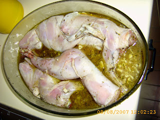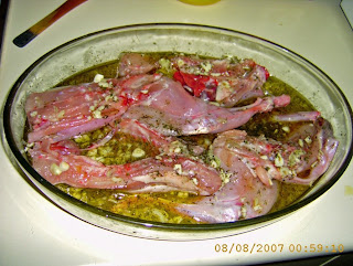Cogemos el conejo si no somos partidarios de comer la cabeza se la quitamos (eso va al gusto). Partimos el conejo en cruz de forma que saquemos 4 piezas, lo colocamos en una fuente grande una vez limpio de forma que la fuente nos pueda entrar en el frigorífico, le añadimos el aliño preparado tal y como nos muestra la imagen