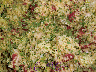 con un tenedor, lo mezclamos todo y le añadimos perejil en polvo. El cous-cous ya está hecho,
