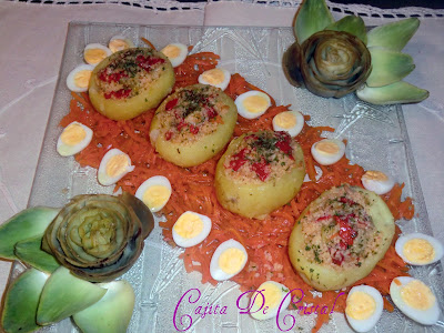 Lavamos bien las patatas, y las ponemos a hervir con la piel durante una media hora, notaremos que están hechas al pincharlas con un cuchillo, pero procuraremos que no queden demasiado cocidas. Las retiraremos y les quitaremos la piel muy fácilmente. Luego, las pasaremos por agua fría para que se compacten. Las cortamos por la mitad, las vaciamos con mucho cuidado con una cucharilla pequeña, mejor de las de moka, cuanto mas pequeña sea la cucharilla, mas fácil nos será vaciar la patata sin que se nos rompa.
