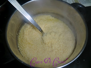 cuando el agua empiece a hervir, agregamos el cous-cous, lo dejamos hervir removiendo durante 3 minutos, lo retiramos del fuego, y lo dejamos reposar 2 minutos para que termine de absorber el agua,