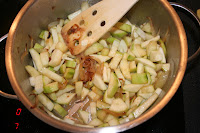 Se sofrie la cebolla picadita en un poquito de aceite, dejamos que se dore muy bien y añadimos la patata y el calabacín cortados en trocitos. Normalmente, dejo que todo se dore bastante.