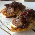 Tapa de patata con queso de oveja semicurado, cedro y compota de cerezas al vino de rioja alavesa