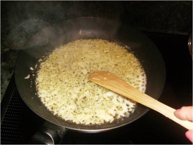 Se le añade 50 ml aceite, o mantequilla, o mitad y mitad como yo he puesto, dejamos que la cebolla se poche sin que tome color.