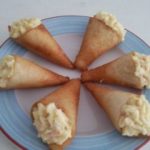 Cogemos las lonchas de pan de molde y le pasamos el rodillo con el fin de dejarlas finitas. Formamos el cono, sujetamos con un palillo y reservamos.