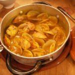 – Al dia siguiente ponlas en una olla con un chorrito de agua y la hoja de laurel,para que se abran al vapor. Una vez abiertas, saca la almeja de la concha y reservalas, junto con un poco de agua de la cocción.