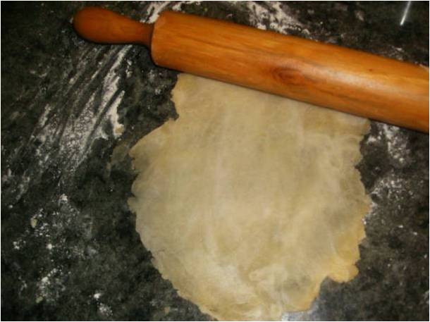 Espolvoreamos la mesa, y tómanos porciones pequeñas y estiramos con el rodillo, dejándola fina