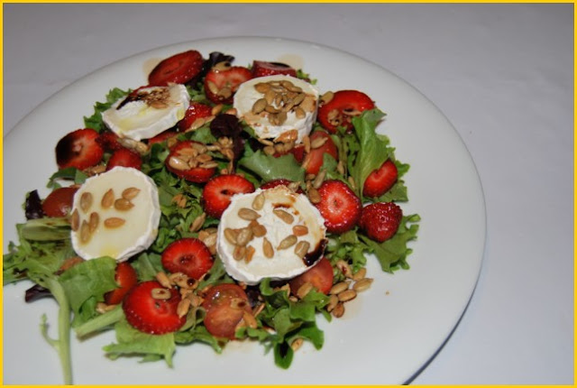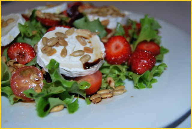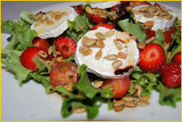 variado de lechugas10 fresas5 tomatitos cherryspipas peladas, a ojo4 cuñas de rulo de queso de cabraaceite de oliva, sal y vinagre de módena
