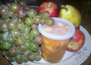 En la foto les muestro los envases en que la conservo, y así tengo un postre fresco y saludable para luego del almuerzo. Cuando empleo un kilo de cada fruta, me salen 10 potes de los de la foto, que equivalen a una ración de postre para una persona. Los compro en una casa de venta de plástico, y la verdad es que son bien económicos, además los cierro y los guardo en la heladera sin molestar ni estorbar con un gran bol, al que hay que introducir un cucharón cada vez que se quiere servir una porción. Además los frascos permiten varios usos y se puede preparar gelatina, helados, postres fríos, cualquier cosa. Y cuando ya no sirven, los usos para cultivo hidropónico.