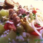 Añadir las naranjas un trocitos, el atún y los huevos cocidos un trocitos.