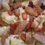 Lava las hojas de lechuga, sécalas y trocéalas, lava y pica la cebolleta. Dora el pollo en una parrilla o sartén con aceite, córtalo en dados grandes.