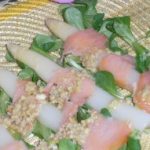 Poner en un plato los cánonigos, encima los espárragos y salmón en trocitos. En un mortero poner los ingredientes restantes para elaborar la vinagreta, machacando un poquito.