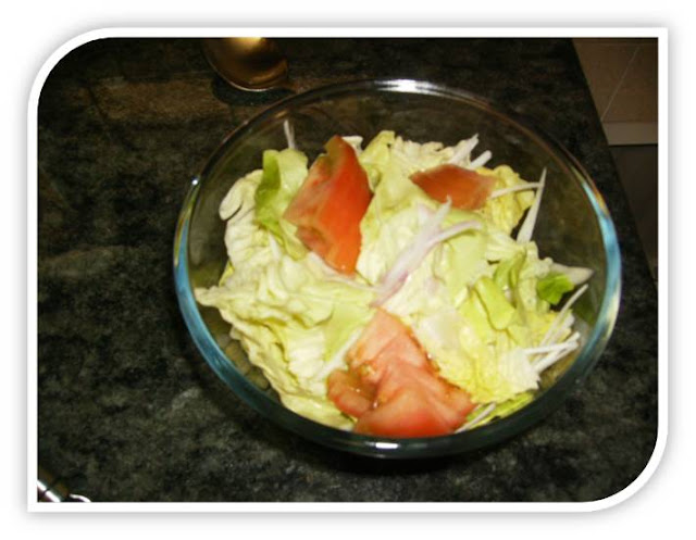 Cortamos un poco de cebolleta en juliana , tomate en rodajas un poco gruesas y estas en cuatro trozos y aliñamos con 3 cucharadas de aceite por 1 de vinagre, si es para muchos mas cantidad de aceite y vinagre, pero siempre 3×1 y ya si os gusta mas fuerte o menos de vinagre ponéis mas o menos