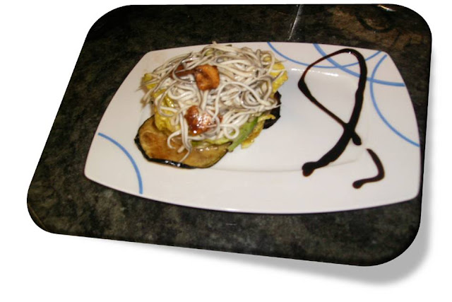 Y ponemos las gulas calientes sobre la ensalada, y adornar con laminas de ajos y reducción  de vinagre balsámico, sencillo pero rico, espero que os gusta besos