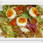 Se monta la ensalada con la lechuga, el huevo fileteado, los palitos en taquitos, las setas pasadas por la planca, las nueces caramelizadas.