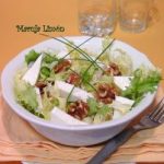 Picamos las nueces y las almendras en trocitos pequeños. Una vez lo tengamos, lo ponemos en un recipiente junto con 1/2 vaso de aceite, dos chorros de vinagre y un poquito de sal. Lo batimos todo hasta que quede una salsa ligada. Una vez esté lista, la apartamos hasta el momento de aliñar la ensalada.