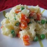 Pelar las zanahorias y cortarlas en cuadraditos, después, ponerlas a cocer en agua fría con sal. Al cuarto de hora de cocción, añadir las patatas peladas y cortadas en cuadrados pequeños. Hervir todo junto durante 30 minutos más.