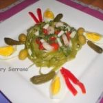Introduce los espaguetis en la sartén que tenías guardada junto al sofrito, las gambas, las almejas y añade dos cucharadas de salsa verde. Rehogamos durante 10 minutos y listo.