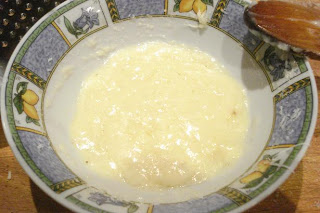 En una fuente, rallar el queso y añadir una cuchara de agua de cocción: amalgamar hasta formar una crema.