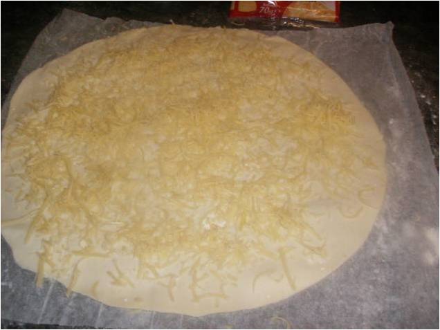 Dejamos en el papel debajo que trae  el hojaldre, estiramos un poco con el rodillo muy  suave, y rallamos el queso Emmental o Gruyere sobre la plancha de hojaldre.