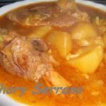 carne lista para añadir las patatas Para empezar, cortamos en trozos pequeños la cebolla y los ajos, y los ponemos en una olla con un poco de aceite. Cuando estén dorados, se le añade la carne (si hay trozos que sean muy grandes, los cortais) y el vino blanco y lo dejais a fuego medio durante 20 minutos aproximadamente. Si alguien le quiere dar un toque picante, este es el momento de echar las bolitas de pimienta negra.