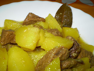 Cuando la carne esté lista, se le añaden las patatas, la hoja de laurel, el azafran, y se cubre todo de agua. Lo dejamos a fuego medio- alto durante unos 35-40 minutos ( hasta que la patata esté blandita) y listo!