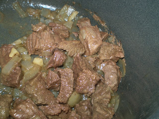 carne lista para añadir las patatas Para empezar, cortamos en trozos pequeños la cebolla y los ajos, y los ponemos en una olla con un poco de aceite. Cuando estén dorados, se le añade la carne (si hay trozos que sean muy grandes, los cortais) y el vino blanco y lo dejais a fuego medio durante 20 minutos aproximadamente. Si alguien le quiere dar un toque picante, este es el momento de echar las bolitas de pimienta negra.