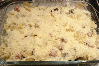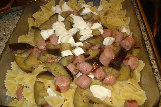 Volcar la pasta en la bandeja y el resto de berenjenas, longanizas y mozzarella.