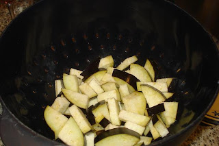 Limpiar la berenjena y cortarla en tacos. Disponer las berenjenas en un colador, salar y dejar durante media hora. Lavar, escurrir y secar con un trapo de cocina.