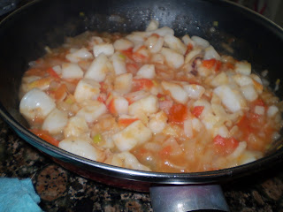 Para empezar, cortamos los tomates, la cebolla y el ajo en trocitos pequeños y lo ponemos en una sartén con una cucharada de aceite a fuego lento, hasta que esté todo doradito.