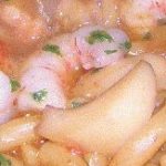 5°) Cuando esté lista la cebolla, retiramos el pimiento y echamos las pastas. Removemos. Colocamos el resto de los ingredientes, excepto el pimiento, las galeras y las gambas (se pondrán más tarde decorando). El caldo hirviendo y el majado. Removemos y probamos de sal.