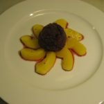 Pera escalfada en vino blanco con corazón helado de vino rosado y jarabe de vino tinto