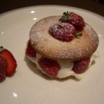 Pera escalfada en vino blanco con corazón helado de vino rosado y jarabe de vino tinto