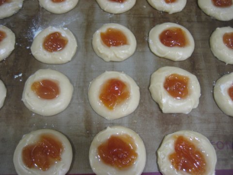 3. Hacer un hoyo en la superficie con la yema del dedo enharinada, y rellenar con una cucharadita de mermelada de cerezas.